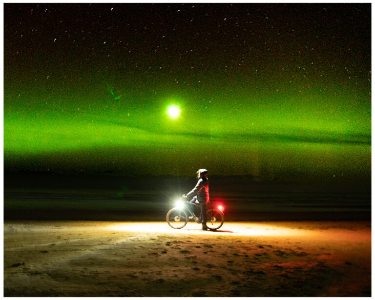 Astonishing photos of the Northern Lights. The cyclist standing in the mysterious light.